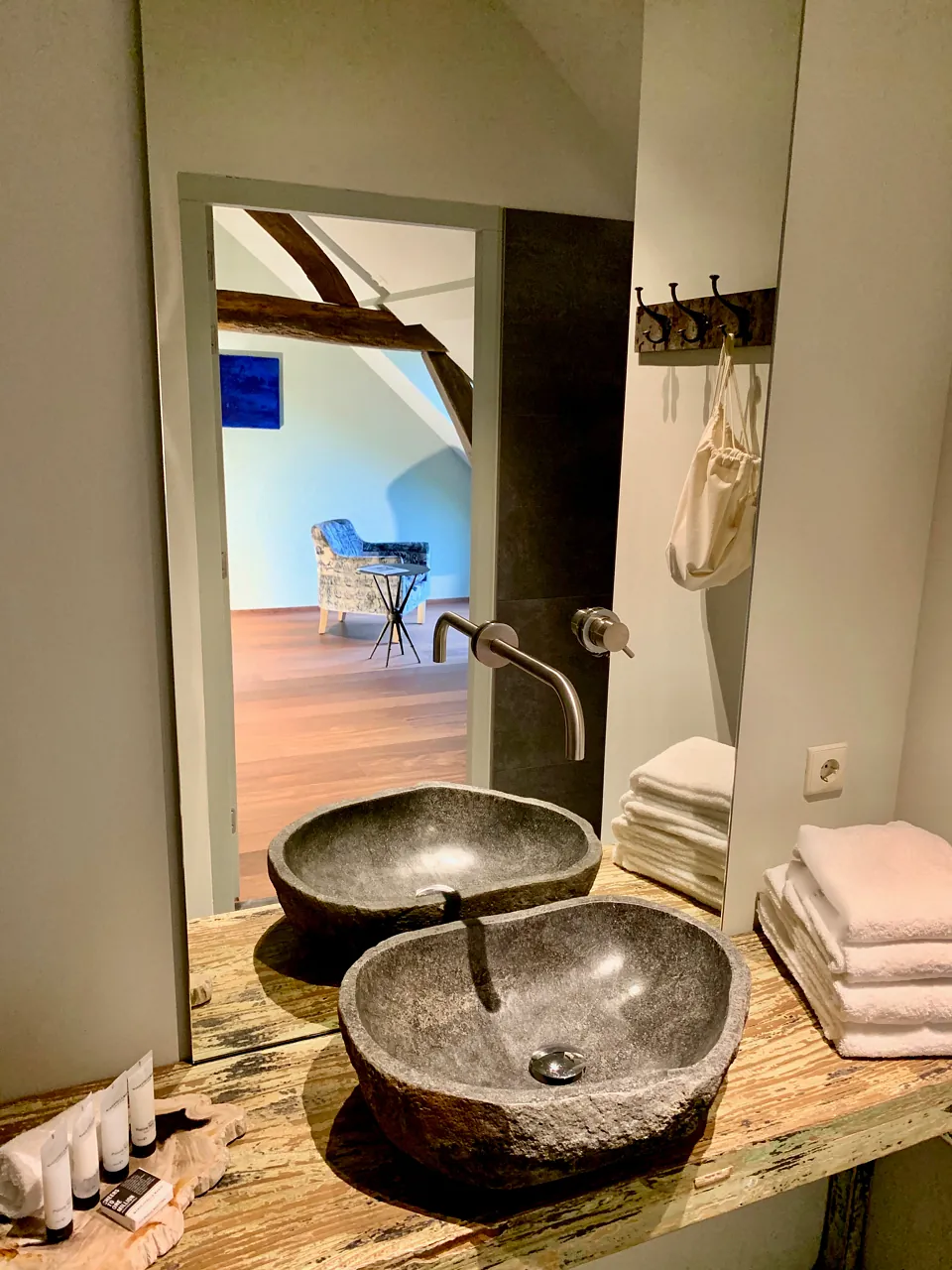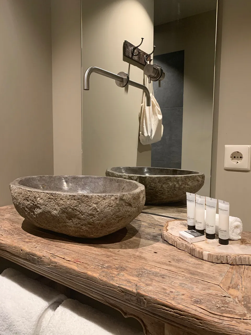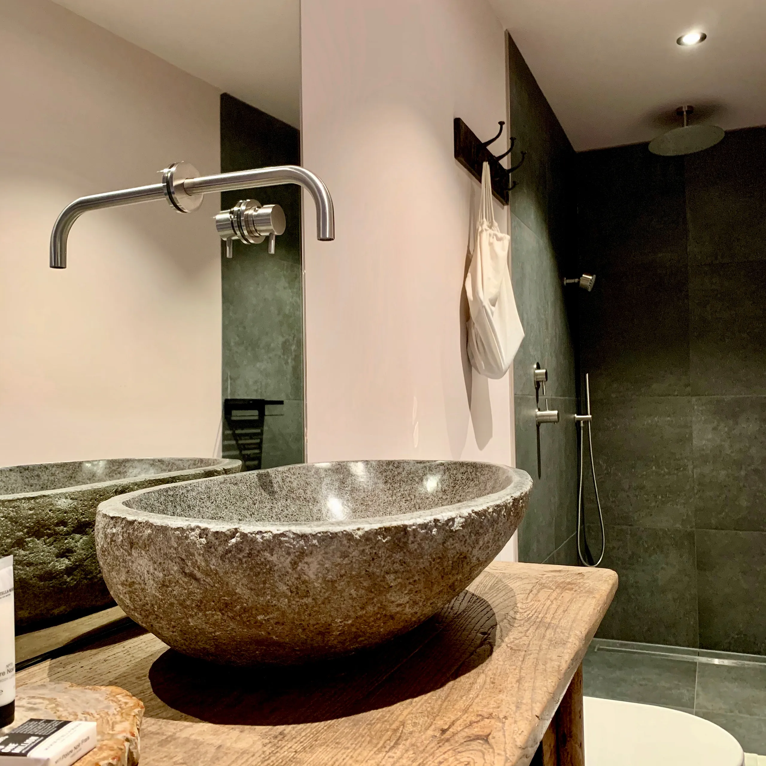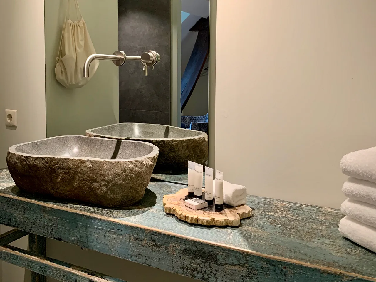De ruime badkamers hebben een sport- hand- en regendouche, prachtige stenen wastafels en een eigen toilet. Zowel binnen als buiten ervaart u rust en ruimte en kunt u genieten van de mooie sferen van dit vakantiehuis.